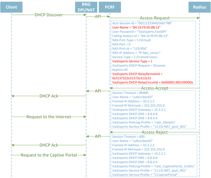 By DHCP request - In this case, when BRAS fixes DHCP requests from the subscriber network, it generates the corresponding Radius requests to obtain DHCP lease parameters that are communicated to the subscriber. In addition, in response to DHCP authentication, you can also transmit session parameters affecting the passage of subscriber traffic. When passed, the Session-Timeout is the lease time. When obtaining DHCP and traffic (IP) parameters separately, you can specify different Session-Timeout values, which, of course, will be quite convenient, for example, issue a lease time of 6 hours, but at the same time re-authorize traffic parameters every hour.