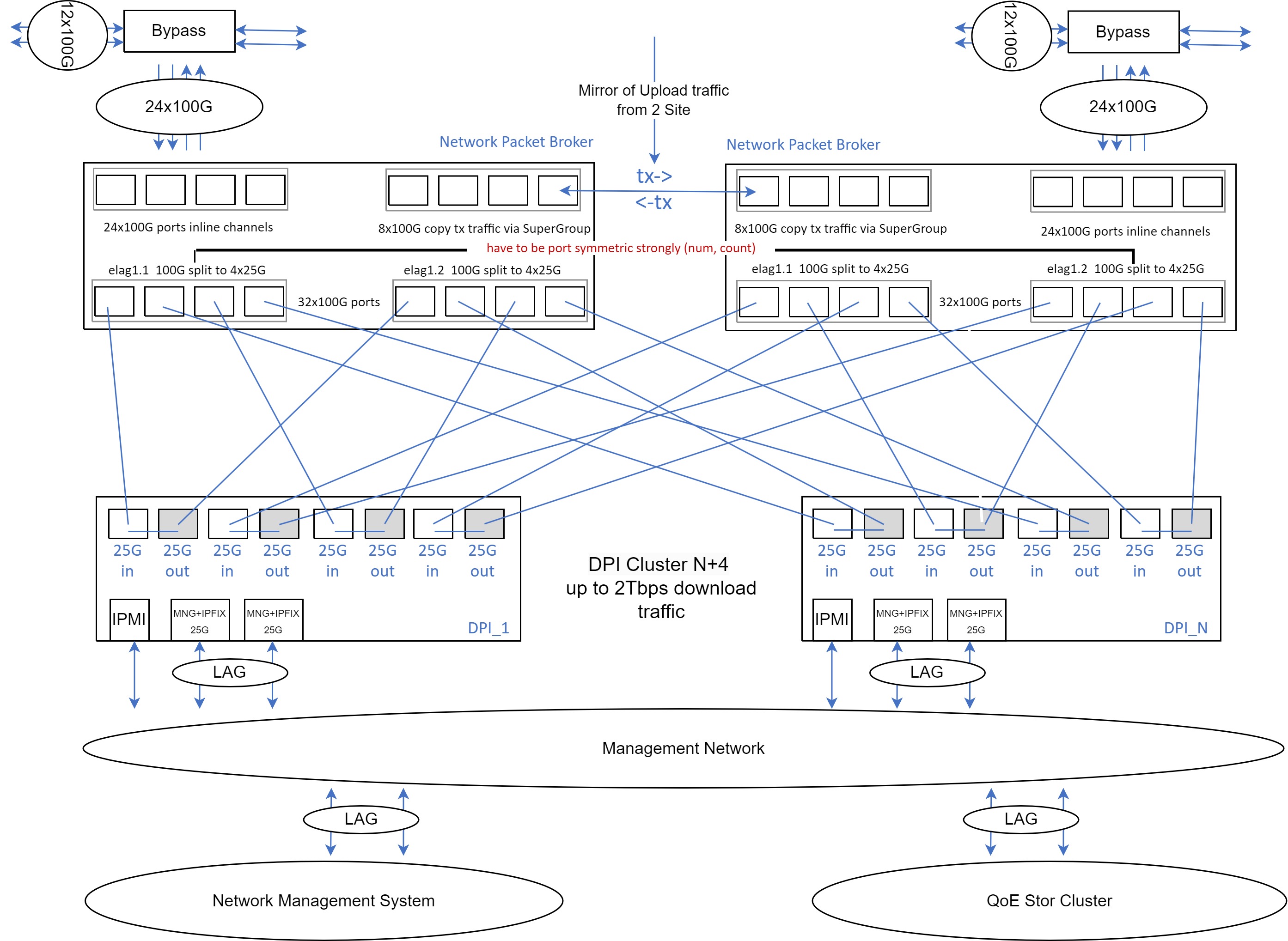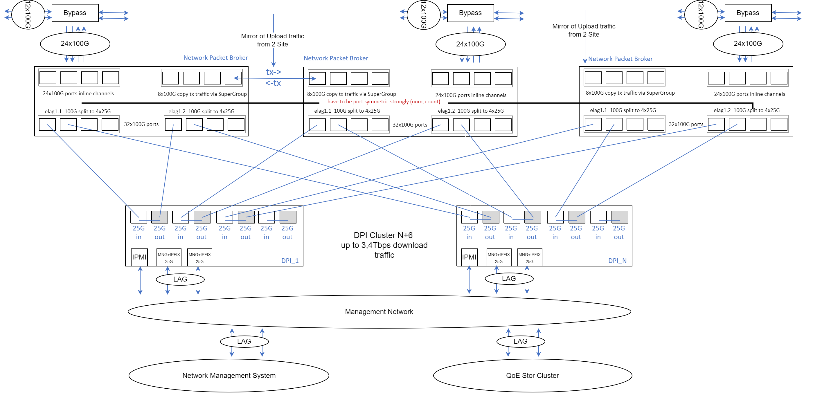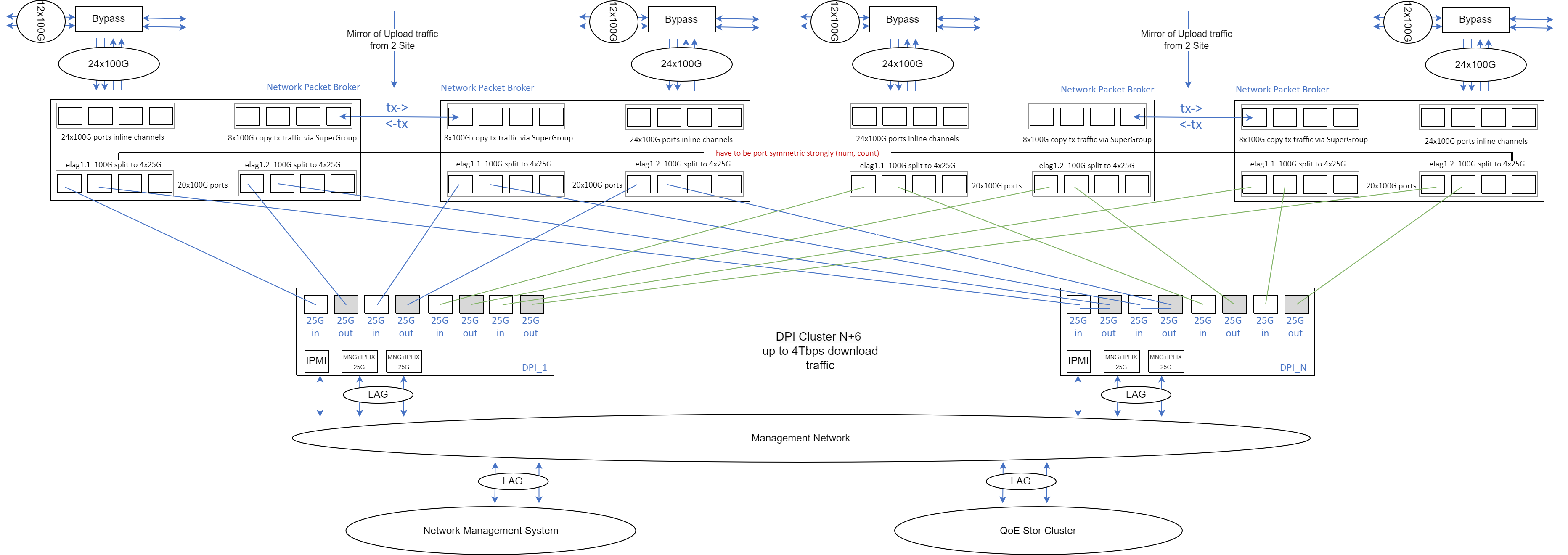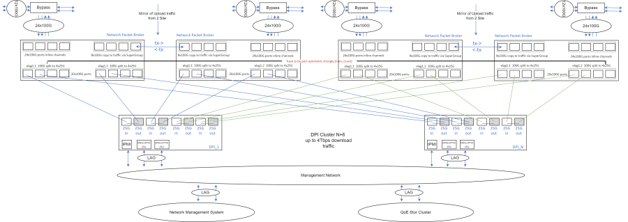 For proper DPI operation, it must receive both forward and reverse subscriber traffic (full bidirectional sessions); otherwise, some functions, including application protocol detection, may not work or function incorrectly. Therefore, it is crucial to ensure that bidirectional subscriber session traffic passes through a single DPI device. Traffic symmetry through DPI is maintained by mirroring outgoing traffic from one site to another and balancing on NPB.