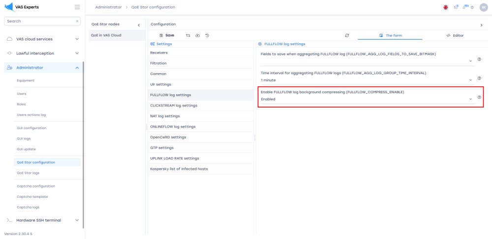 Step 2. Go to Administrator → Configuration QoE Stor → Fullflow log settings.