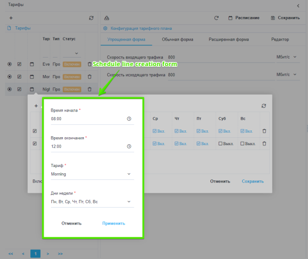 This section allows you to create schedule for tariff plans. After the schedule is created and saved, selected sub-tariffs will be applied according to its settings.