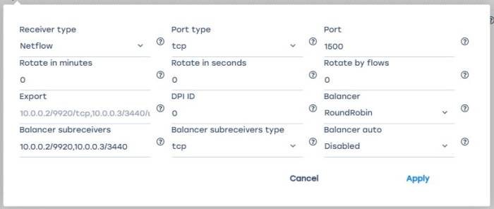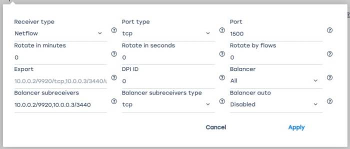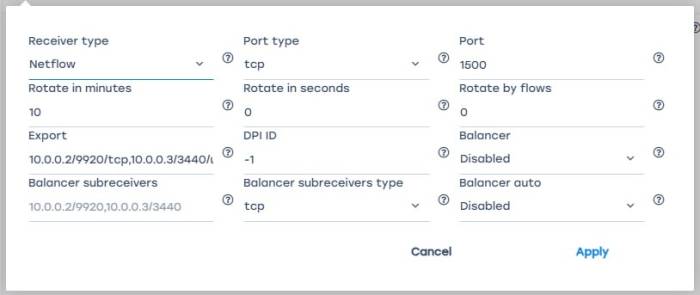 | Receiver type | FULLFLOW CLICKSTREAM DNSFLOW | Receiver type: NetFlow or Clickstream | Values: - NetFlow - receiver for NetFlow data - Clickstream - receiver for Clickstream data | |
