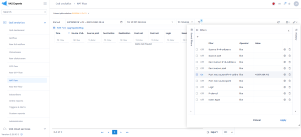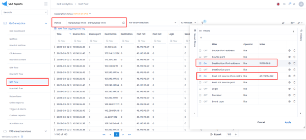 Then in the GUI you need to open the section NAT flow, select a period, enter the source and destination IP.
