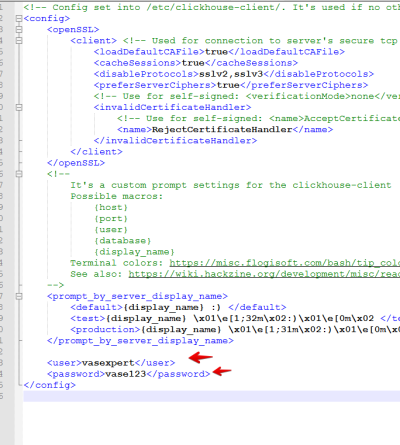 In the file /etc/clickhouse-client/config.xml under the <config> section, add the parameters <user> and <password>