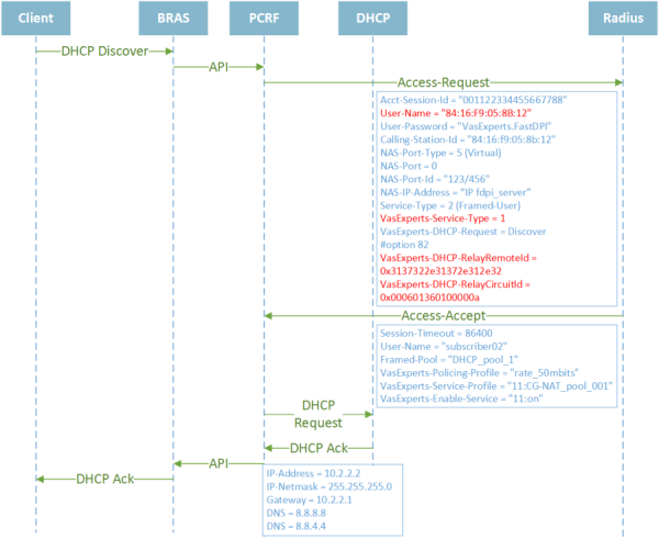 FastPCRF, upon receiving the pool name in Access-Accept, requests the subscriber's IP address from the DHCP server. Upon receiving a response from the DHCP server, fastPCRF extracts the IP address from it, combines the options specified in the DHCP response with the Access-Accept attributes, and sends the authorization response to the subscriber via fastDPI.