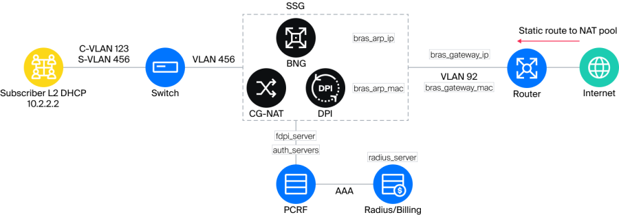 BRAS DHCP L2 mode means that the subscriber recieves an IP-address via DHCP Proxy and proceeds to ААА in the Billing system. Then the subscriber is terminated by Stingray Service Gateway(SSG) and transferred to border equipment.