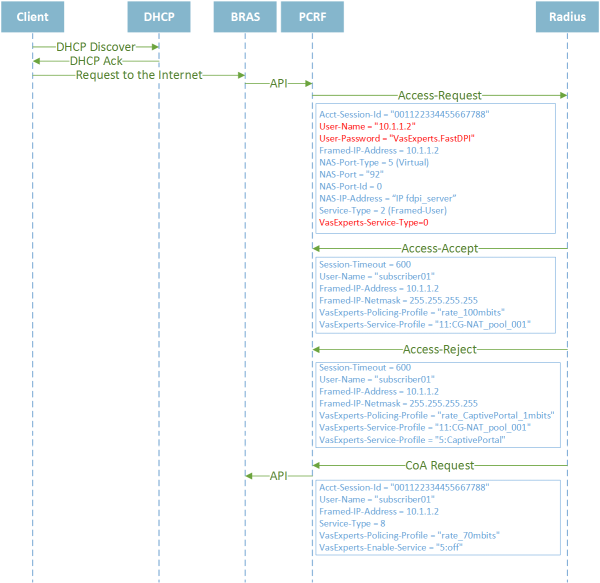 The fastPCRF server actually acts as an authentication server (L3 BRAS) for the fastDPI: for outgoing client traffic fastPCRF requests the Radius server for the client authentication, policing profile (analogue of the tariff plan) and service profiles. CoA (Change of Authorization) alerts are also supported - notification of the Radius server about changes in the user settings (balance exhaustion, policing changes, etc.)