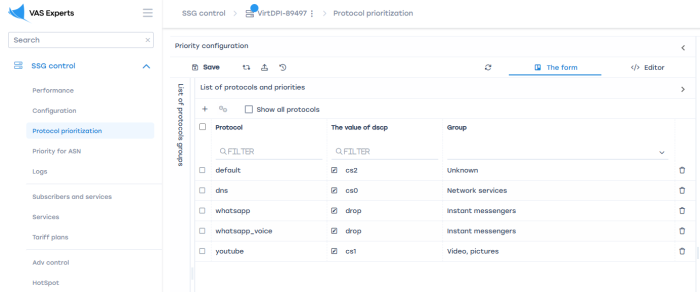 - Assign classes to protocol groups in the column "The value of DSCP". Classes range from cs0 (highest priority) to cs7 (lowest), with "drop" blocking the protocol. Assign high priority (cs0) to VoIP applications, Video, and messenger groups, and low priority (cs7) to the P2P group.