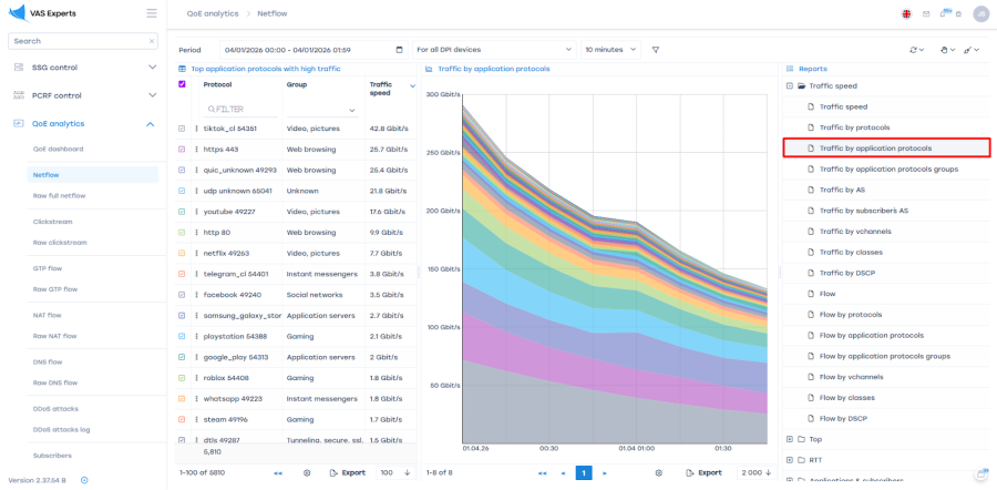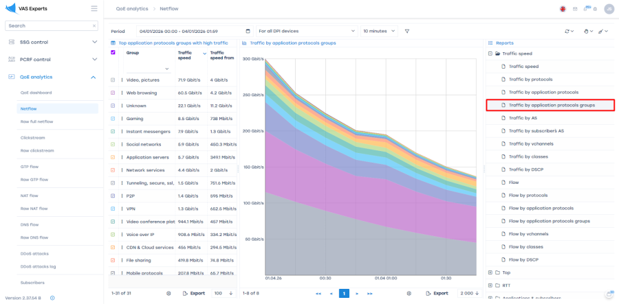 The top list and graphs display the most important protocols, showing their "weight" and activity periods. - Analyze traffic by groups of application protocols. The system identifies thousands of protocols. To avoid analyzing and configuring each separately, our developers grouped them.