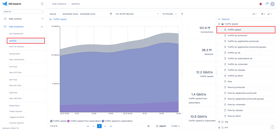 - Navigate to the "Netflow" section. In the right part of the screen, find the "Reports" section, and expand the "Traffic Speed" list