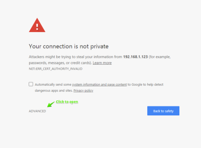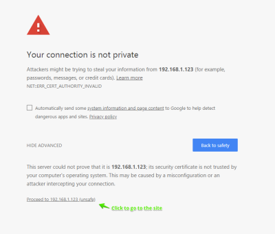 Since a self-signed ssl certificate is installed, the window that follows will appear in the browser (in different browsers it appears in different ways, in the screenshot below Google Crome is shown):