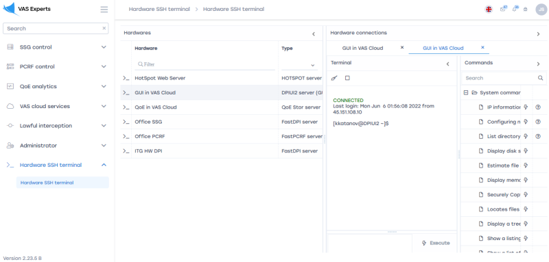 To go to the Hardware SSH Terminal section, open the HARDWARE SSH TERMINAL menu and HARDWARE SSH TERMINAL.