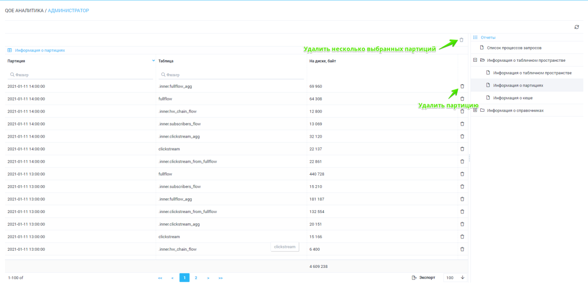 In this section you can see a list of all table partitions, and how much disk space they take up.