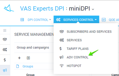 To switch to the section, open the menu SERVICES CONTROL and click ADV CONTROL.
