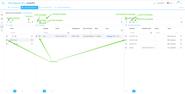 Here you can create advertising campaigns for the selected advertising campaign profile. Along with deleting, starting and stoping the previously created advertising campaigns.