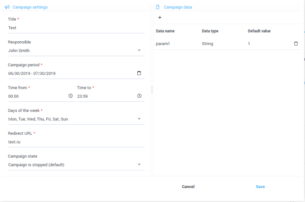 - The values of the advertising campaign parameters for this subscriber (if they were added when creating/editing an advertising campaign). In case you leave these fields blank, the default values specified while creating/editing an advertising campaign will be set.