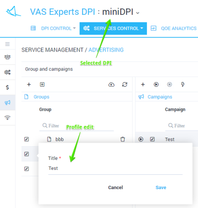 Here you can create profiles for combining several adv campaigns, as well as edit and delete them. The form for creating/editing advertising campaigns profiles is shown in the figure below.