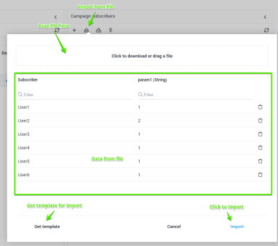 Before importing subscribers and their data into a campaign, it is recommended to download a template Excel file for this campaign (the download button is shown in the figure) in order to make sure that: