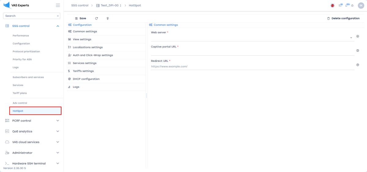 WiFi HotSpot configuration is carried out in the GUI section SSG Control → HotSpot.