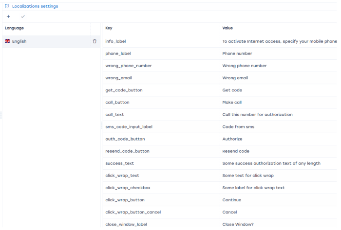 - Select the added language to configure parameter values. Change values by clicking on them.
