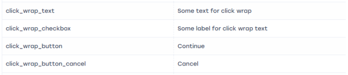 The click-wrap text is configured in the “Localization Settings” section under parameters prefixed with “click_wrap”: