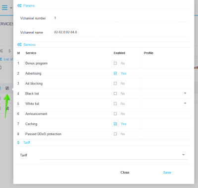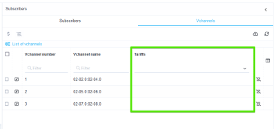 The picture below shows a table of vchannels, which has a column "Tariffs", in which it is possible to view which tariff plans are applied to the vchannel.