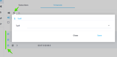 It is possible to connect and disconnect the tariff plan for several vchannels at once. To do this, select several lines (using ctrl or shift) and click the Tariffs button.