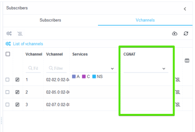 The picture below shows the vchannel table, which has a column "CGNAT", in which it is possible to view which CGNAT profiles are applied to the vchannel.