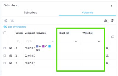 The picture below shows the vchannel table, which has 2 columns, in which it is possible to view which "Black list" and "White list" profiles are applied to the vchannel.