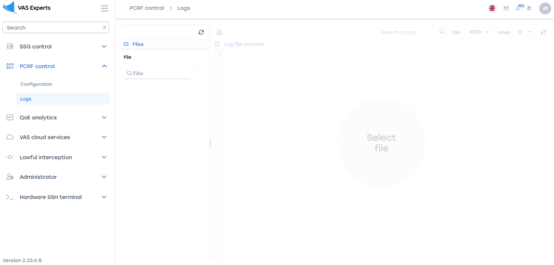 To go to the section, click the PCRF control menu item, then click the Logs menu item.