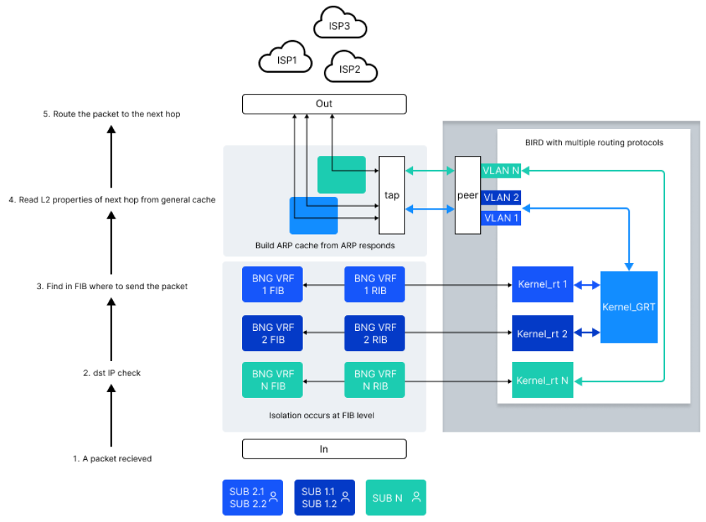 Due to isolation, the same subnet can be accessed through different hops and different routers and routed differently. After the FIB is built, when traffic flows, first the subscriber is authorized and placed in the required VRF. The FIB can be updated after the subscriber is authorized. The subscriber can be moved between VRFs dynamically after the subscriber is authorized by CoA.