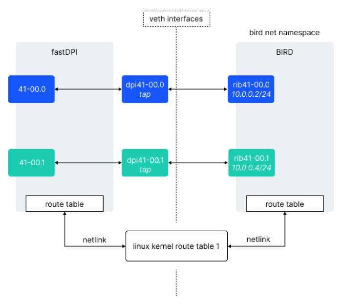 ip link set dpi41-00.1 up ip netns exec bird ip link set lo up ip netns exec bird ip link set rib41-00.1 up