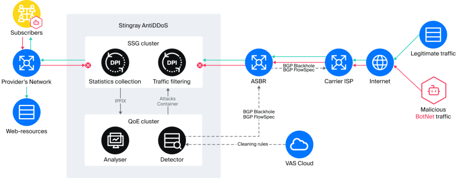 The development of DDoS protection aims to clean traffic before it reaches the internet. Deploying SSG AntiDDoS complexes across multiple operators will stop BotNet traffic inside the operator network. Centralized management via VAS Cloud allows lightning-fast reaction to any attacks while leaving transport channels between operators, IX, and data centers untouched. Upon detecting an attack on any resource with SSG, parameters for mitigation can be forwarded to the operator from which the illegitimate traffic originates.