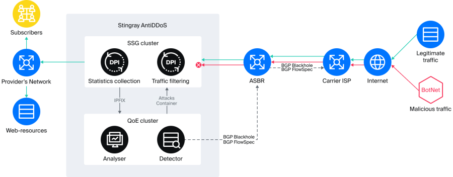 - If operator channel capacity is exhausted, Attacks container can be sent to a special script that automatically adds subscriber IPs to blackhole, ensuring maximum infrastructure protection. Incoming traffic to these subscribers is dropped on the uplink channel.
