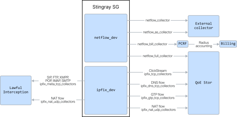 - NetFlow for billing (RADIUS accounting) — information on the volume of transmitted data per subscriber. This stream is sent to fastPCRF and converted into RADIUS accounting,