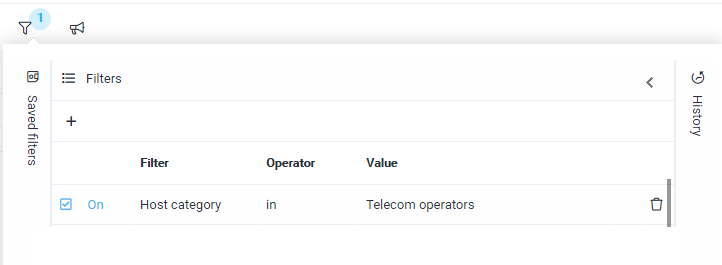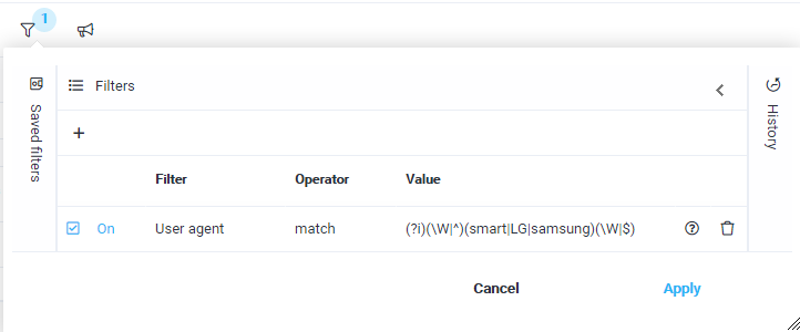 - create a filter filter by Host, use match operator to apply a regular expression search: (?i)(\W|^)(smotreshka|ivi|okko|netflix)(\W|$) containing the following OTT resources list to be searched: