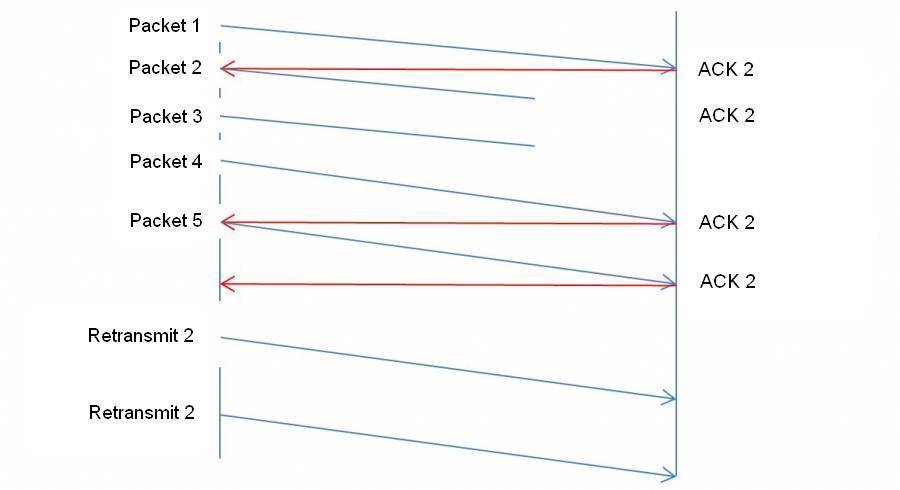 - TCP Fast Retransmission corresponds for the following case: the sender resends the data immediately after assuming that the sent packets are lost without waiting for the expiration of the transmission timer. Usually it can be triggered by receiving several consecutive (usually three) duplicate acknowledgments with the same serial number. For example, the sender transmitted a packet with sequence number 1 and received an acknowledgment equal to sequence number plus 1, i.e. 2. The sender understands that the next packet with number two is expected. Suppose that the next two packets are lost and the recipient receives data with serial number 4. The recipient resends the acknowledgment with the number 2. Upon the receiving the packet with the number 5, the sender still sends the acknowledgment with the number 2. The sender sees three duplicate acknowledgments, assumes that the packets 2 and 3 were lost and resend them without waiting for a timer to expire.