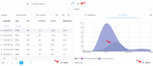 DPI exports information about delays between the client and the DPI and between the DPI and the host during TCP connection establishment - RTT.