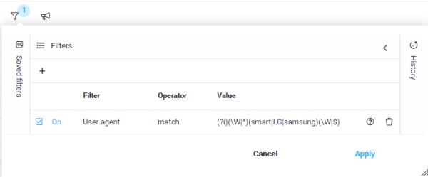 - Create a filter using math and enter a regular expression `(?i)(\W|^)(smart|LG|samsung)(\W|$)` to find specific devices: