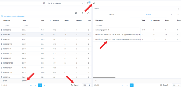 DPI exports unique UserAgents sent in HTTP requests. The QoE module aggregates information per IP (or login, if used). The statistics include each Smart TV detected behind subscriber NAT.