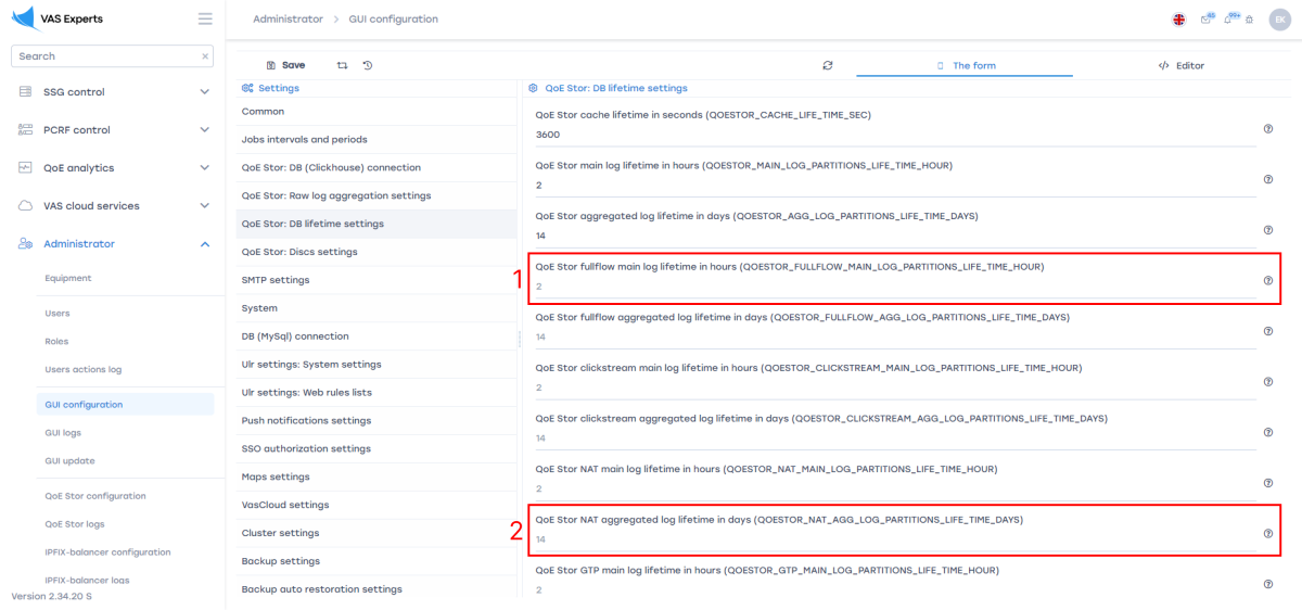 In the GUI: Administrator → GUI Configuration → Settings → QoE Stor → Database lifetime settings: