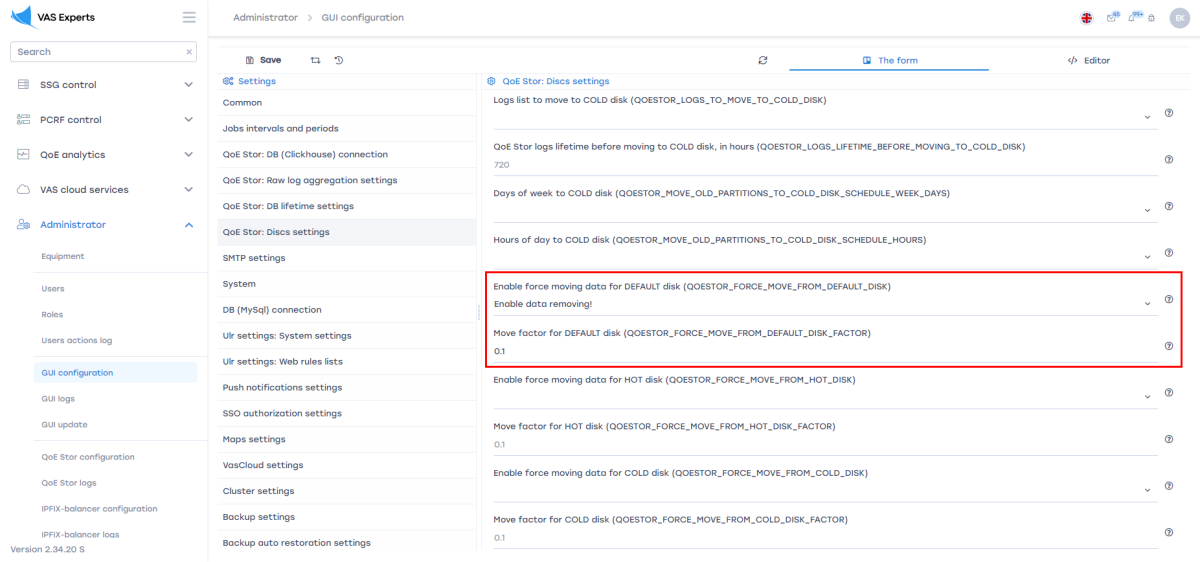 When increasing data retention, it is recommended to enable automatic deletion of old data when the disk is full: Administrator → GUI Configuration → Settings → QoE Stor → Disk Settings → Enable forced data relocation … → select Enable data deletion! → Relocation coefficient for DEFAULT disk … → set value 0.1.