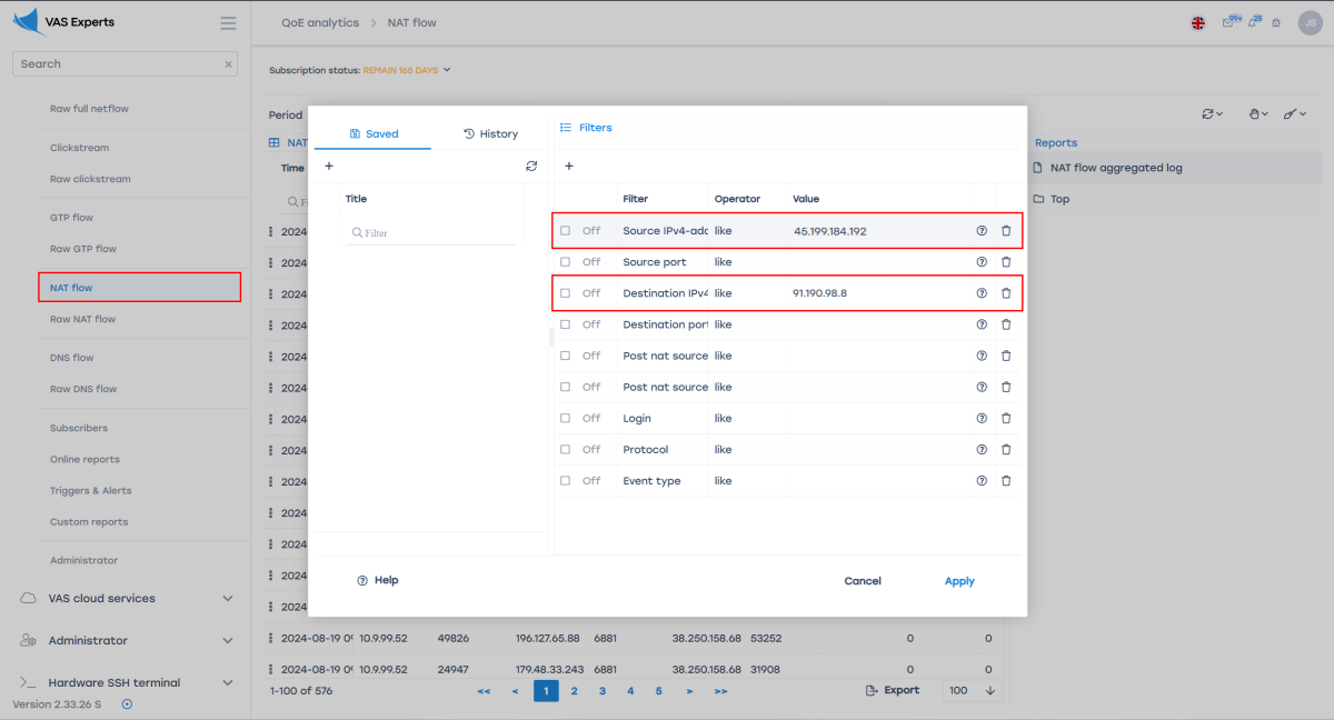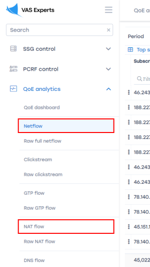 Subscriber activity data becomes available after NAT log creation — see NAT Flow configuration. In the GUI, go to QoE Analytics → NAT Flow. Then: