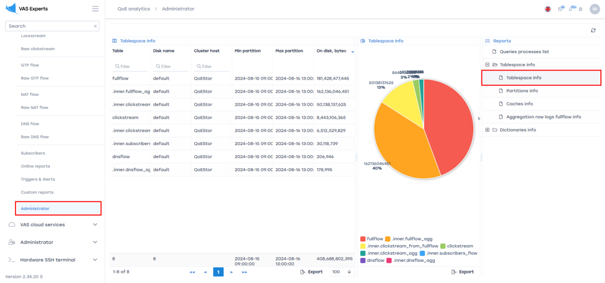 You can check how much disk space logs occupy in QoE Analytics → Administrator → Reports → Table space information.