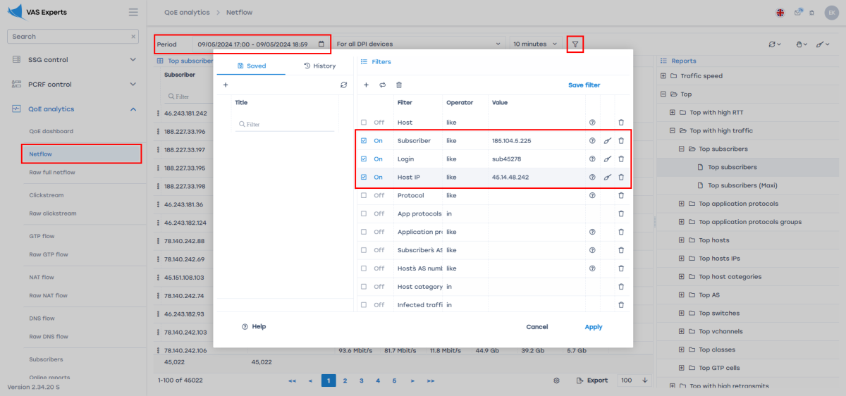 - Enable filters “Subscriber”, “Login”, and “Host IP” (check the boxes)