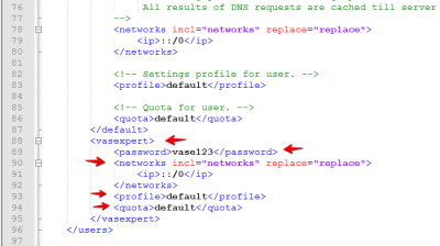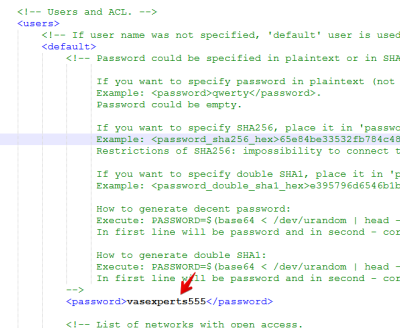 To do this, on the server where QoE Stor is installed, in the file /etc/clickhouse-server/users.xml under the <users> section: