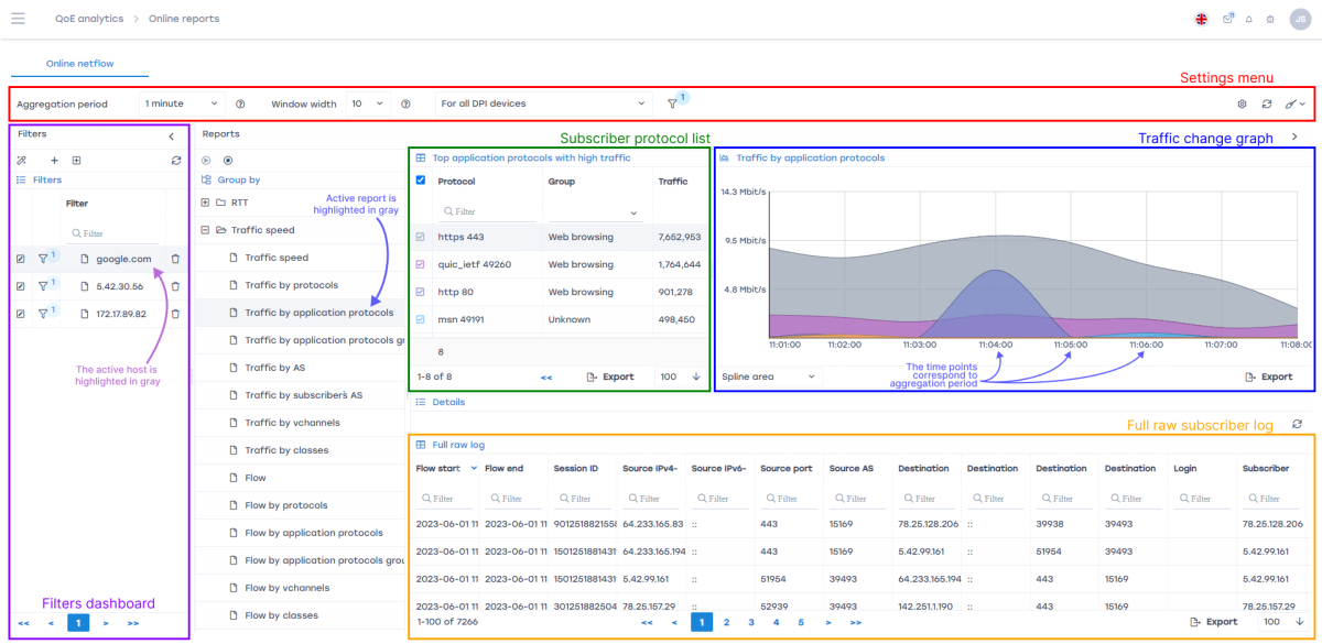 The structure of online reports is the same as in the “NetFlow” section, but with some differences: