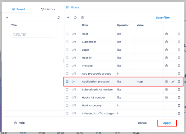 - Select the “Application protocol” filter;