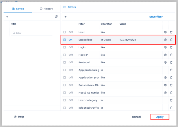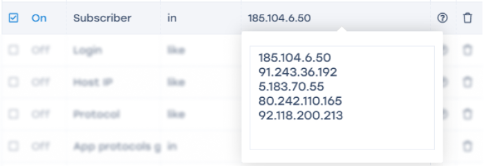 1. Select a filter. To search by IP — use “Subscriber”, to search by login — use “Login”;
