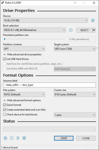 > dd if=VEOS-8.7-x86_64-Minimal.iso of=/dev/sdz bs=1M